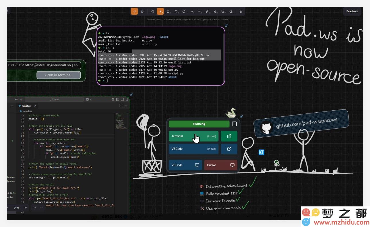 pad.ws是一款创新的在线工具,将白板与代码编辑器完美结合,为开发者和设计师提供了全新的协作体验。它支持多种编程语言,并具备实时协作、无限画布等功能,满足了远程团队和教育场景的多样化需求。用户反馈显示,pad.ws以其流畅的用户体验和开源特性受到广泛欢迎,未来有望推出更多创新功能。