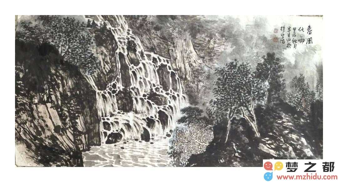 李军生的山水画多为大幅作品,物象繁密却有条不紊。他善于运用“加法”构图,使画面层层叠叠、丰富厚实、变化无穷。无论是四尺横幅还是小六尺作品,都能让人感受到他作品中的雄伟壮丽。他运用泼墨、积墨等技法,使墨与水相互渗化,形成朦胧诗意的画面效果。同时,他笔法巧妙,刚健自然,线与画面内容紧密结合,支撑起整个画面的骨象意义。