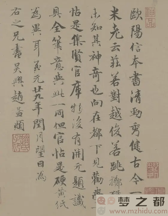 在流传过程中,《仲尼梦奠帖》得到了众多名家的题跋和鉴赏。其中,清高宗弘历在26岁时见到此作,惊叹不已,题写了“真迹无疑”四字,并加盖了“乾隆”白文连珠印。元代书法家郭天锡和赵孟頫也分别留下了跋文,对欧阳询的书法艺术给予了高度评价。