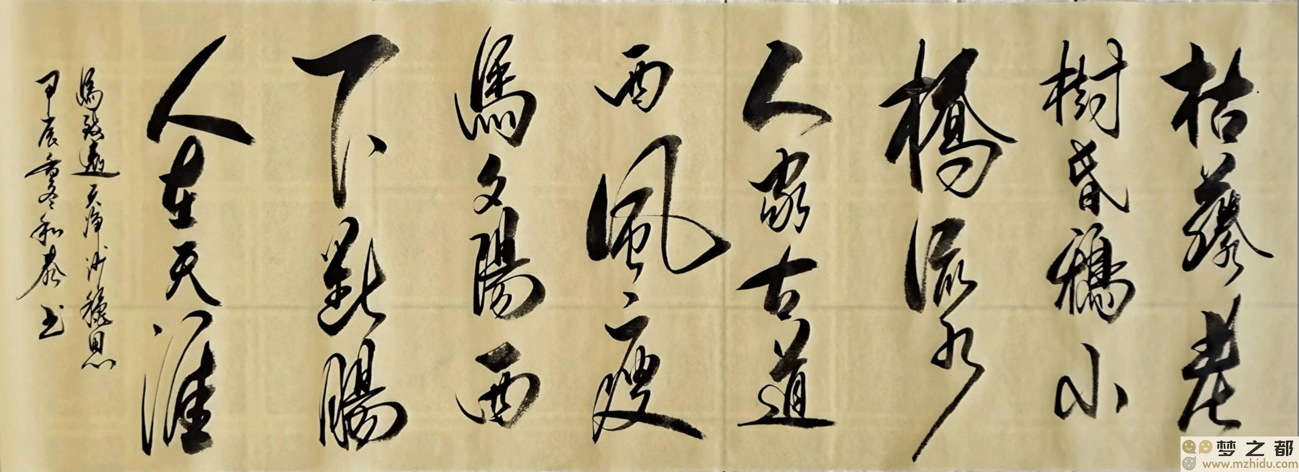 赵和泰老师还将元代马致远的名篇《天净沙·秋思》以行草书的形式呈现在宣纸上,与诗词主题深刻契合,笔墨间透露出一种苍凉悠远的情感。作品中,大字的处理沉稳厚重,小字部分则更显灵动,两者搭配和谐,营造出一种静谧而深远的艺术氛围。赵和泰老师对书法艺术的深刻理解和娴熟技艺,在这幅作品中得到了完美的展现。