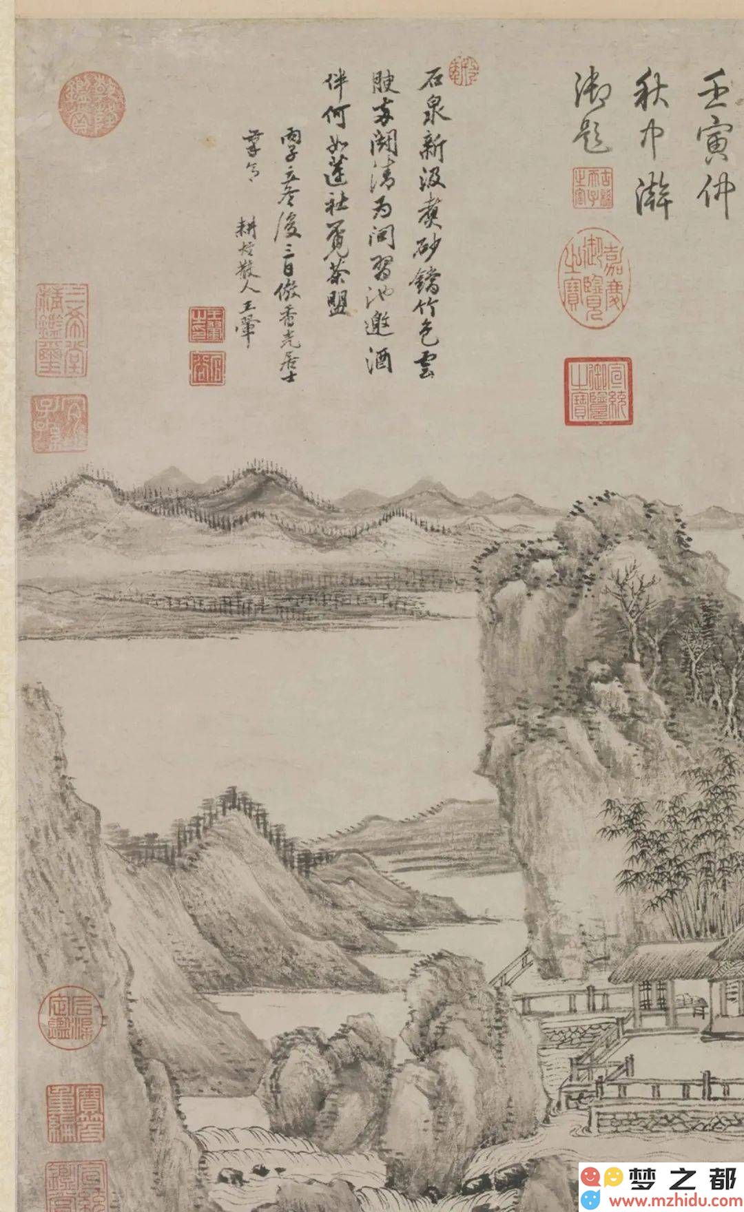 这幅画作上还留有清高宗的行书题跋:“崇山为障带清池。取水烹茶便且宜。著个胎仙茗鼎侧。知伊善反魏家诗。”这不仅是对画作本身的赞美,也是对王翚艺术成就的认可。题跋中的“壬寅仲秋中澣御题”更是为这幅作品增添了几分皇家气息。
