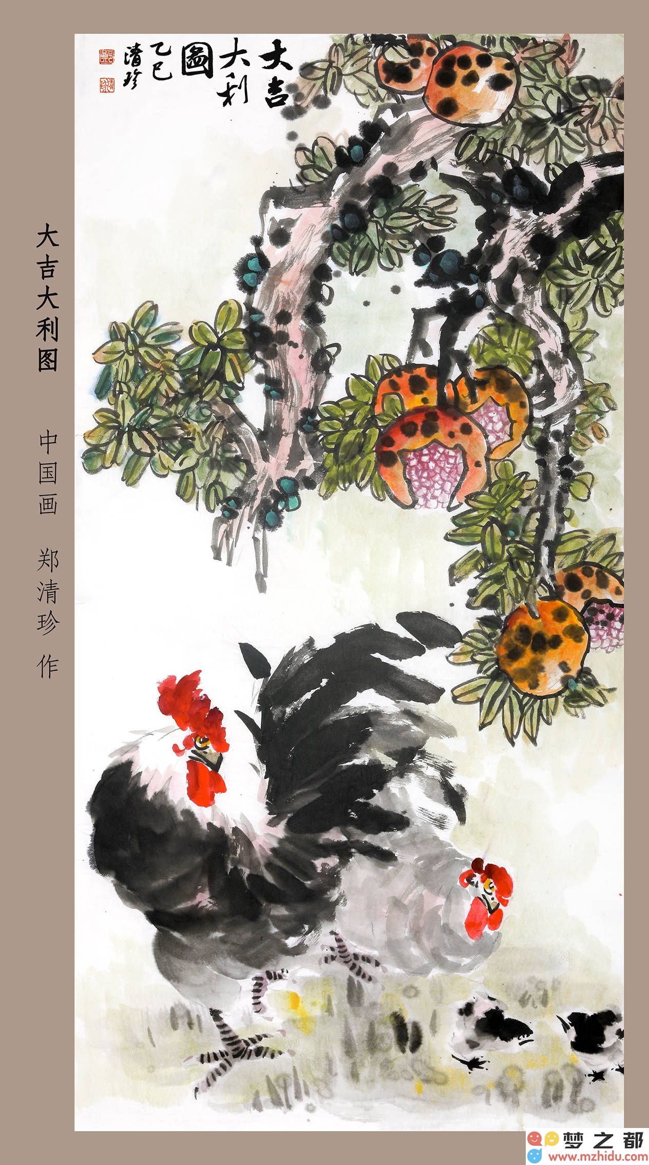 郑清珍先生的雄鸡画作还蕴含着丰富的文化寓意。在中国传统文化中,鸡与“吉”谐音,象征着吉祥如意、大吉大利。先生通过精心塑造雄鸡形象,将这份美好的祝愿融入每一幅作品之中。无论是《大吉大利图》中携带着雏鸡的雄鸡,传递出家庭和睦、繁荣昌盛的美好愿景;还是《艳阳照大地》中迎着红日的雄鸡,寓意着光明与希望的到来,都让观者在欣赏画作的同时,深刻感受到传统文化的深厚底蕴和温暖力量。