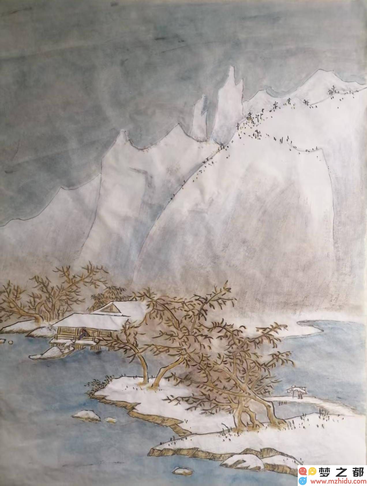 《白鹭洲》以中国传统山水画的笔法,描绘了一幅江南水域的旖旎风光。画面中,山、石、水、树巧妙融合,构成了一幅意境空灵、笔墨秀润的佳作。庞荣连巧妙地运用了“高远”与“平远”的构图方式,使得画面视野开阔,心境舒展。近景的怪石嶙峋、松木苍郁,中景的层峦叠嶂、烟波浩渺,以及远景的若隐若现,共同营造出一种“山色有无中”的意境之美。而江面上飞翔的白鹭,以及点缀其间的几艘小舟,更是为画面增添了几分灵动与生气。