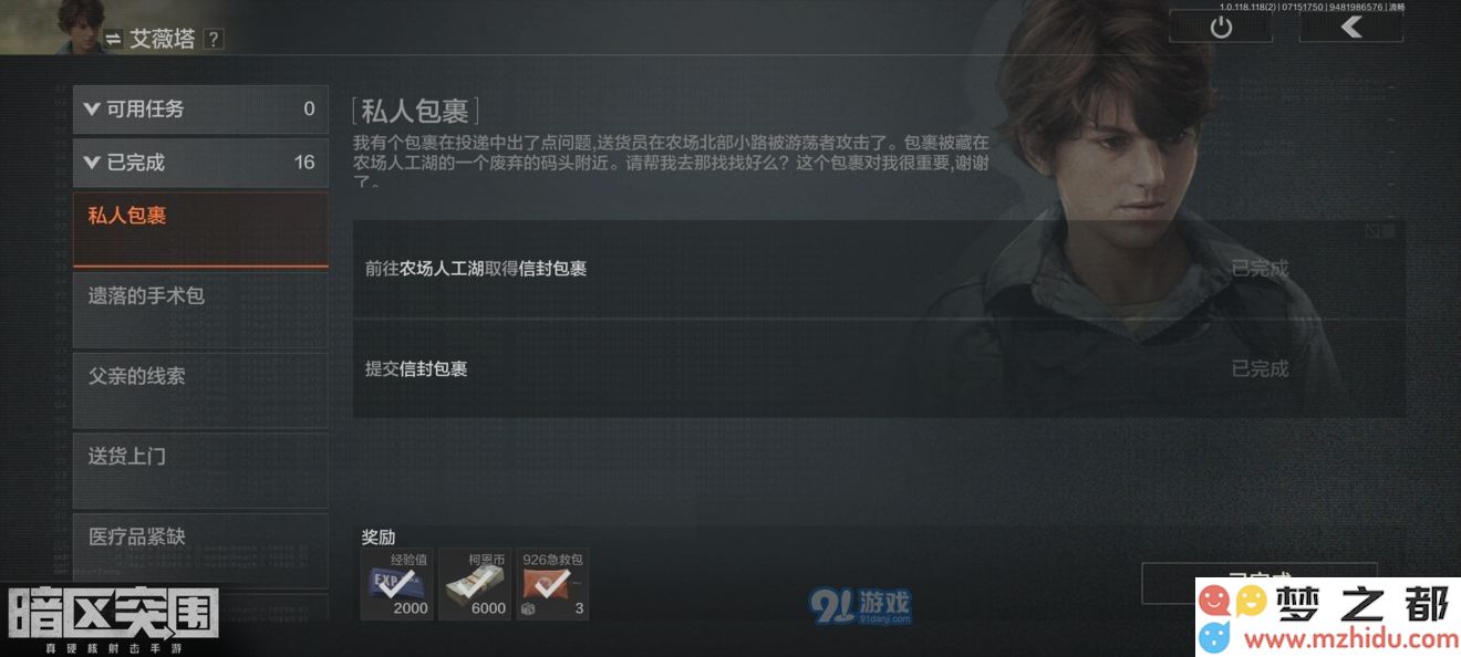 第二个任务,农场坠机点边上的岗哨二楼拿到钥匙(武器箱右角边上)(同样先放保险箱里,),去猎人通道边上的管理处小屋区父亲的手术包