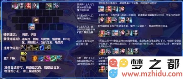 刺客遇到同行是非常正常的事情,所以前期一定要压连胜,因为是2费卡,有22张,所以4阶段2家三星都是很正常的,但是如果卡特比较天谴,到了4-6的正确做法是抬一人口,把羁绊挂的更高,靠血量吃分。